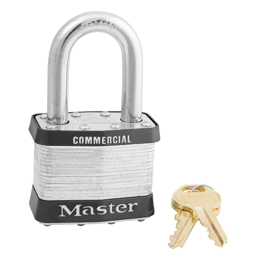 The Master Lock No. 25KALF Laminated Steel Padlock, Keyed Alike - multiple locks open with the same key - features a 51mm wide reinforced laminated steel lock body providing extra strength and a 38mm tall, 10mm diameter hardened steel shackle for excellent cut resistance. The ball bearing locking mechanism provide extra pry resistance making it ideal for industrial applications and the rekeyable, 5-pin W27 cylinder helps prevent picking.