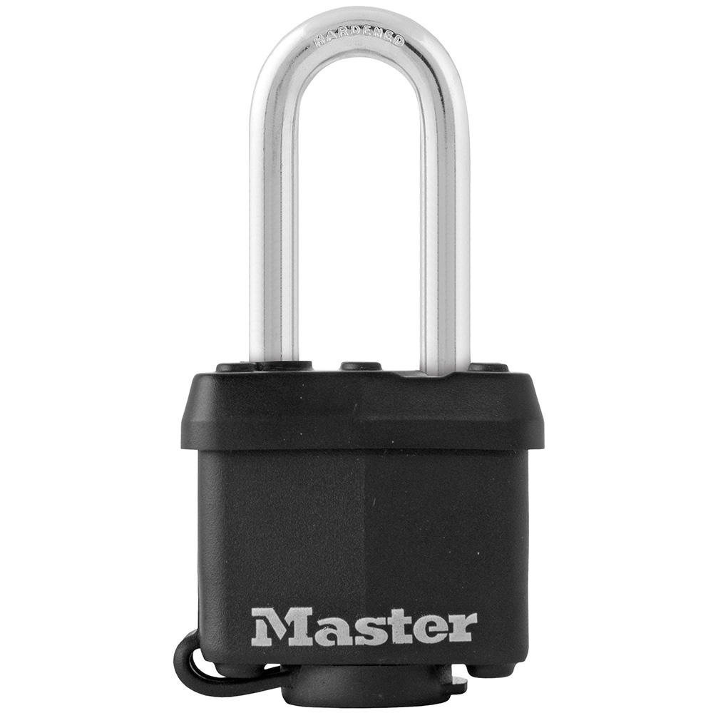 The Master Lock No. 311KA Covered Laminated Padlock, Keyed Alike - multiple locks open with the same key - features a 40mm wide laminated steel body and a 51mm tall,10mm diameter hardened steel shackle with molded cover for superior cut and weather resistance. A black weather resistant thermoplastic shell is designed to withstand the elements for outdoor protection against moisture, dirt & grime. ball bearing locking mechanism provide additional pry resistance and a 4-pin cylinder adds pick resistance.