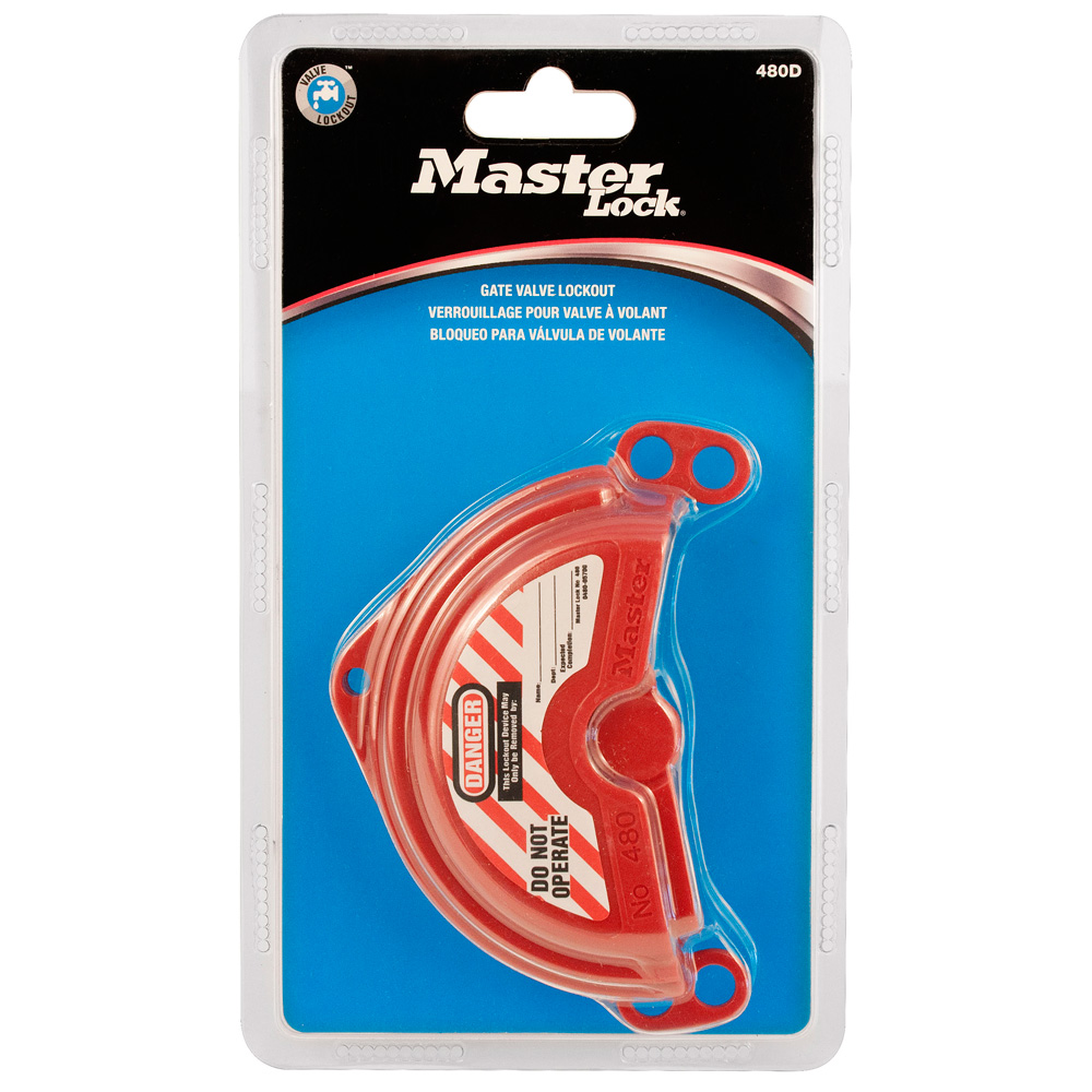 The Master Lock No. 480D Rotating Gate Valve Lockout Device - packed in carded packaging for showroom display - features a 30mm depth and 19mm stem opening for 25mm to 76mm diameter valve handles to surround the valve operating handle to protect against accidental valve opening. The unique, patented rotating design allows for easier installation in confined space applications. Tough, lightweight, dielectric Zenex™ Thermoplastic body withstands chemicals and performs effectively in extreme conditions. Includes high-visibility permanent safety labels. This carded product is suitable for display in commercial showrooms.