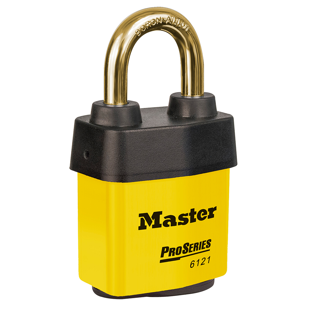 The Master Lock No. 6121KABYLW ProSeries® Weather Tough® Covered Laminated Padlock, Keyed Alike - multiple locks open with the same key - features a 54mm wide heavy steel body to withstand physical attack and a 29mm tall, 8mm diameter brass shackle for extra corrosion resistance. The exclusive cover protects this padlock from harsh elements & a high security, rekeyable 5-pin cylinder with spool pins is virtually impossible to pick. The yellow, high visibility colour cover provides the ability to distinguish between departments, employees, access, etc.