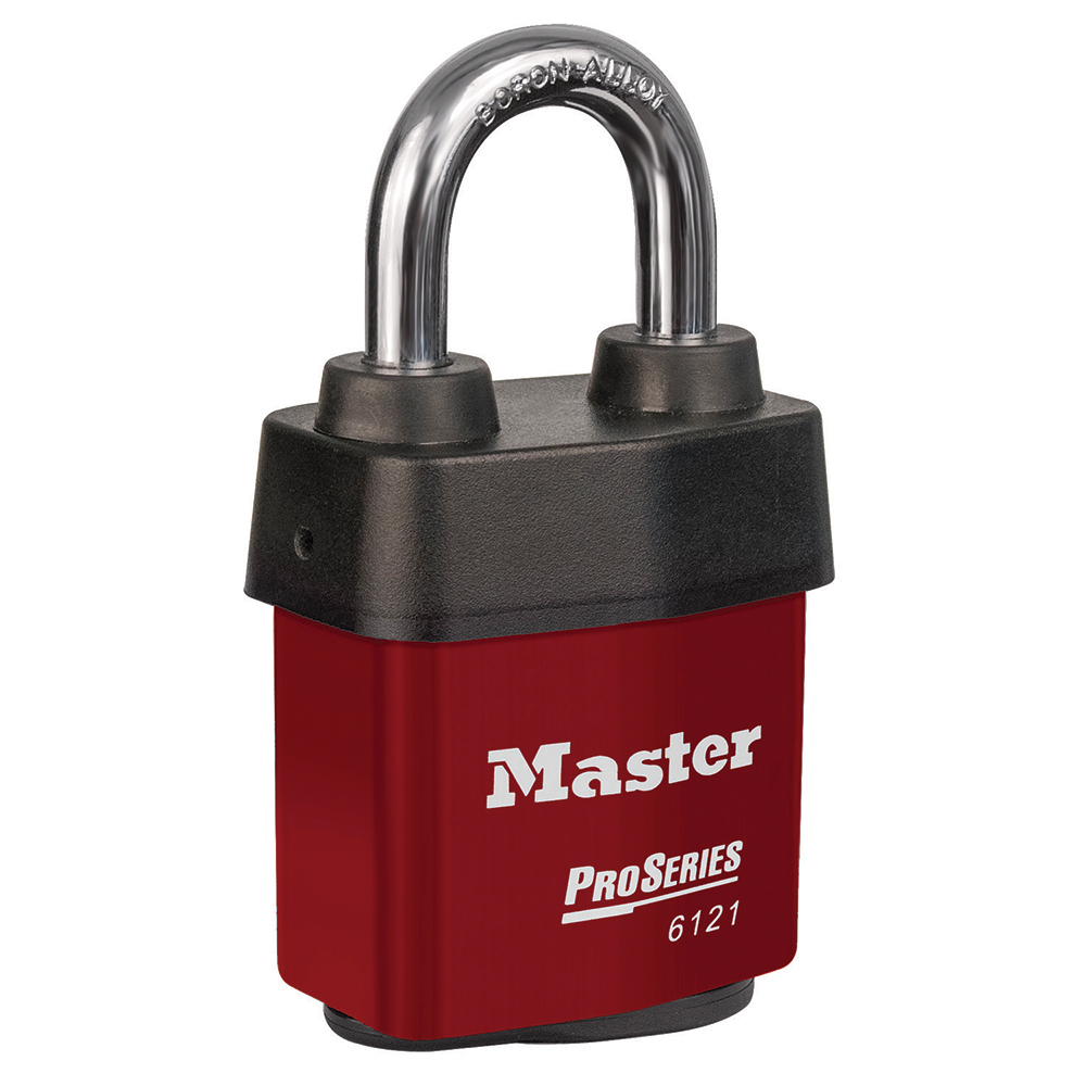 The Master Lock No. 6121KARED ProSeries® Weather Tough® Covered Laminated Padlock, Keyed Alike - multiple locks open with the same key - features a 54mm wide heavy steel body to withstand physical attack and a 29mm tall, 8mm diameter hardened boron alloy shackle for superior cut resistance. The exclusive cover protects this padlock from harsh elements & a high security, rekeyable 5-pin cylinder with spool pins is virtually impossible to pick. The red, high visibility colour cover provides the ability to distinguish between departments, employees, access, etc.