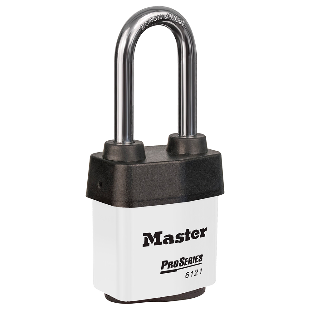 The Master Lock No. 6121LJWHT ProSeries® Weather Tough® Covered Laminated Padlock multiple locks open with the same key - features a 54mm wide heavy steel body to withstand physical attack and a 63mm tall, 8mm diameter hardened boron alloy shackle for superior cut resistance. The exclusive cover protects this padlock from harsh elements & a high security, rekeyable 5-pin cylinder with spool pins is virtually impossible to pick. The white, high visibility colour cover provides the ability to distinguish between departments, employees, access, etc.
