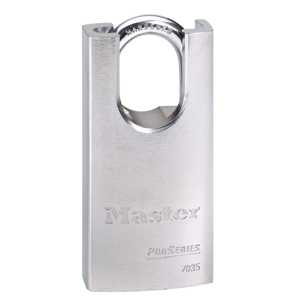 The Master Lock No. 7035 ProSeries® Shrouded Padlock features a 40mm heavy hardened steel body with chrome rustproofing and a 28mm tall, 6mm diameter hardened boron alloy shackle for superior cut resistance. The shackle shroud protects from bolt cutters and a dual ball locking mechanism resists pulling and prying. Designed for commercial/industrial applications, a high security, rekeyable 5-pin cylinder with spool pins is virtually impossible to pick.
