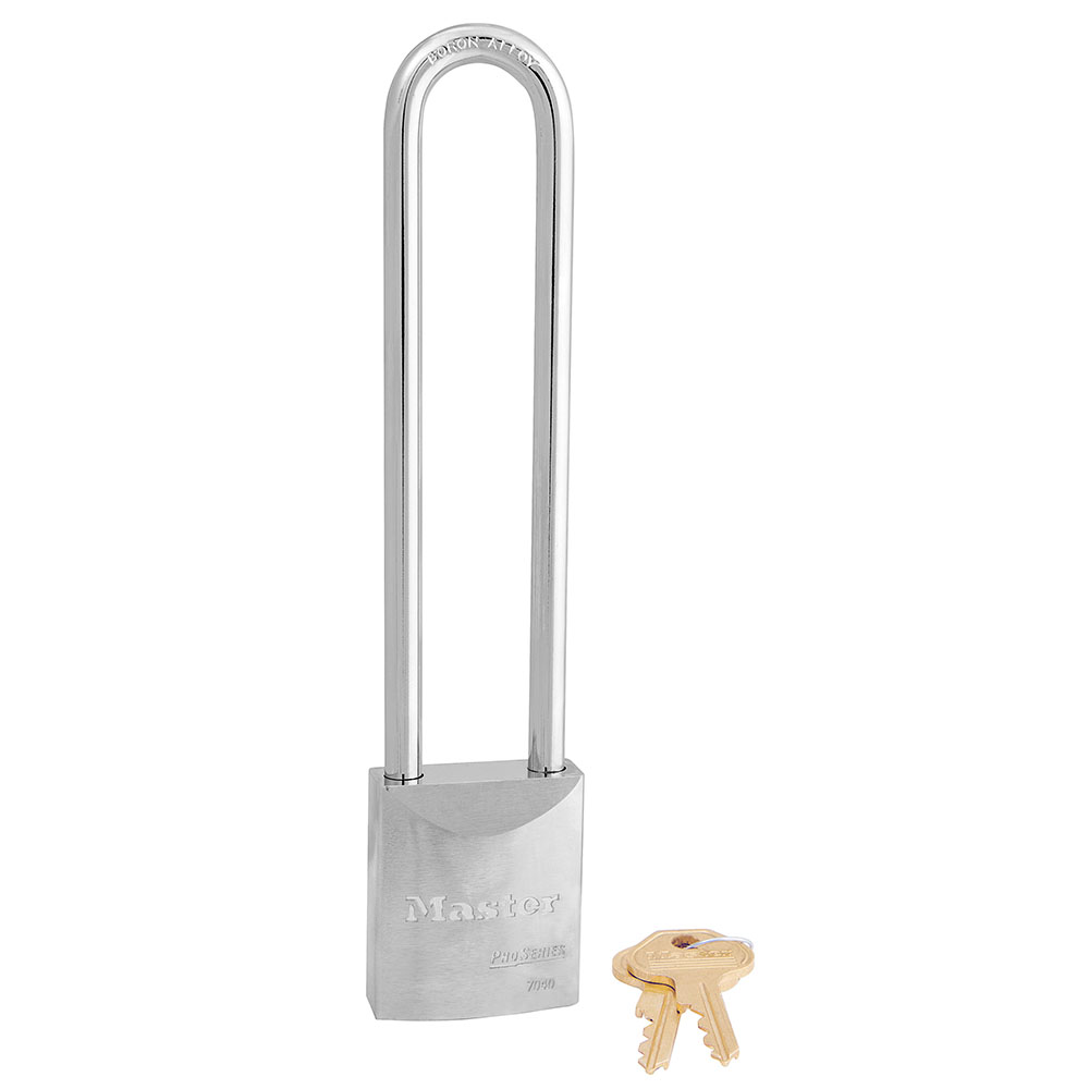 The Master Lock No. 7040KALN ProSeries®Solid Body Padlock, keyed alike - multiple locks open with the same key - features a 44mm heavy hardened steel body with chrome rustproofing and a 14,3cm tall, 8mm diameter hardened boron alloy shackle for superior cut resistance. Designed for commercial/industrial applications a dual ball locking mechanism resists pulling and prying and a high security, rekeyable 5-pin cylinder with spool pins is virtually impossible to pick.