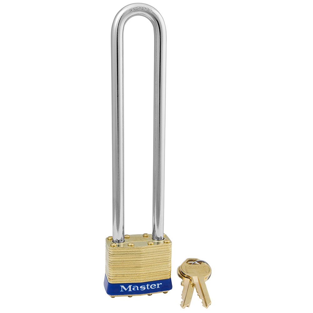 The Master Lock No. 82KALN Laminated Brass Padlock, Keyed Alike - multiple locks open with the same key - features a 44mm wide laminated brass body for superior corrosion resistance and a 15cm tall, 8mm diameter hardened steel, chrome plated shackle for excellent cut and weather resistance. The ball bearing locking mechanism provide extra pry resistance making it ideal for industrial applications and the rekeyable, 5-pin W81 cylinder helps prevent picking.