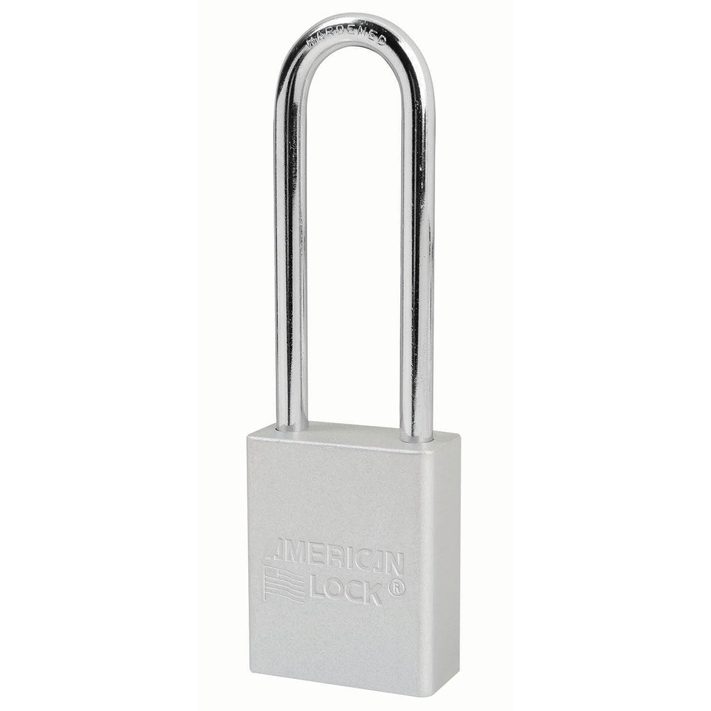The American Lock No. A1167CLR Aluminum Padlock features a 38mm wide clear anodized aluminum body with a 75mm tall, 6mm diameter chrome plated, boron alloy shackle for superior cut resistance. Featuring a 6-pin APTC14 cylinder, the anodized finish makes padlock suitable for lockout in food processing facilities and corrosion resistant finish ideal for tough environments.