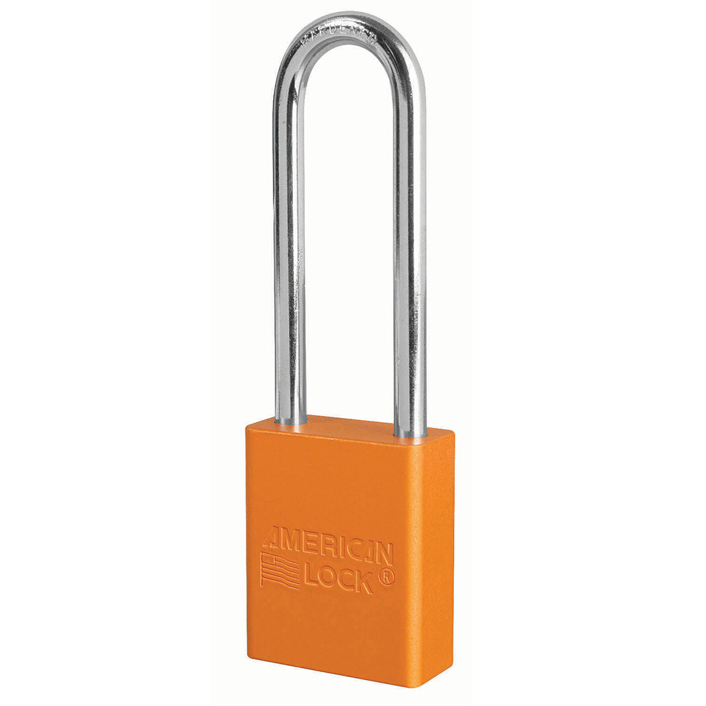 The American Lock No. A1167KAMKW417ORJ Aluminum Padlock, Keyed Alike - multiple locks open with the same key - features a 38mm wide orange anodized aluminum body with a 75mm tall, 6mm diameter chrome plated, boron alloy shackle for superior cut resistance. Featuring a 6-pin APTC14 cylinder, the anodized finish makes padlock suitable for lockout in food processing facilities and corrosion resistant finish ideal for tough environments. Master keyed - a master key opens all the locks in the system although each lock has its own unique key.