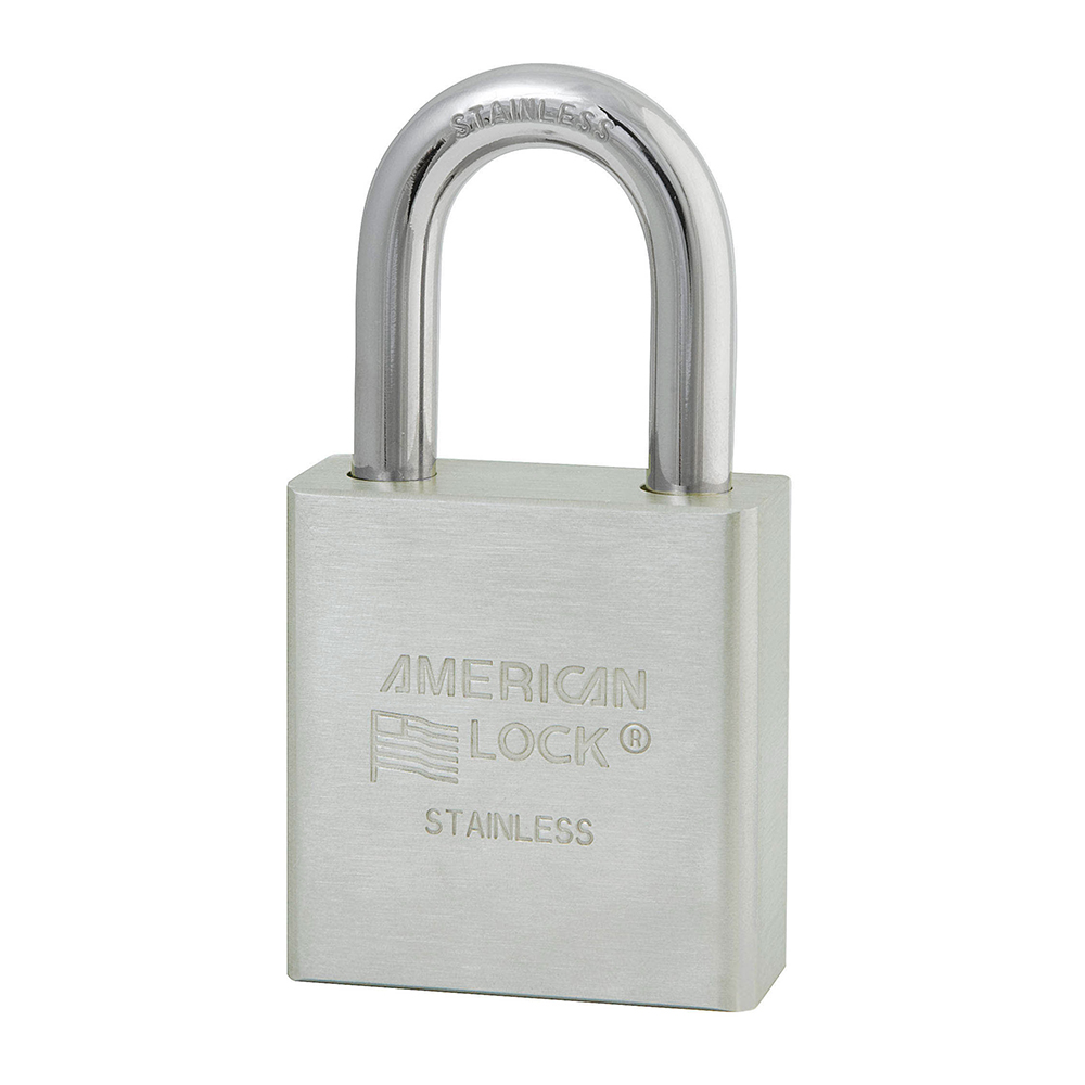 The American Lock No. A5400 Solid Stainless Steel padlock features a 44mm wide solid stainless steel body and a 30mm tall, 8mm diameter stainless steel shackle with dual ball locking to offer strong resistance to cutting, sawing and prying. The stainless steel body, shackle, ball bearings, springs, trap door and brass cylinder and actuator exceed ASTM Grade 6 requirements for padlock corrosion resistance. Rekeyable 5-pin APTC12 cylinder is easy to service and provides tens of thousands of key changes.