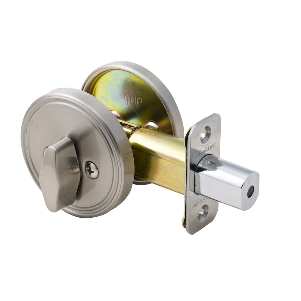 The Master Lock No. DS0515 features a single sided deadbolt, with thumb turn inside, no exterior keyway. The deadbolt offers ANSI GRADE 3 performance and the satin nickel finish provides a sleek appearance. The Ten Year Limited Warranty provides peace of mind from a brand you can trust.