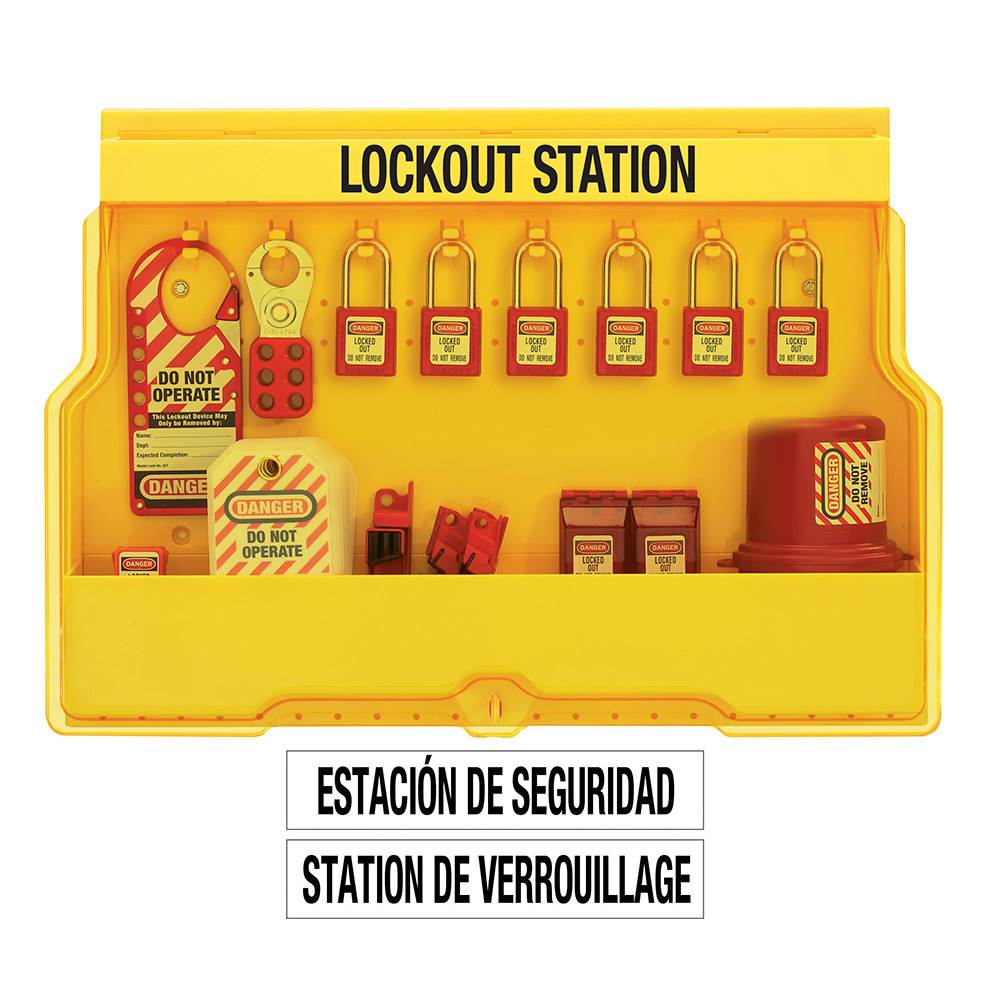 The Master Lock No. S1850E410 Lockout Station is a large capacity station focused on electrical lockout. It is equipped with 410RED Zenex™ Thermoplastic Padlocks, hasps, safety tags and high-use electrical lockout devices. The station comes marked ‘Lockout Station’ in English, with Spanish and French labels included for optional application. Designed for departmental lockout needs, the station includes 8 hanger clips that each hold 2 lockout padlocks or hasps, and holes at the bottom offer a place for pegs or hooks to hang bulky devices. Durable construction helps ensure long life in manufacturing facilities. The covered station keeps out dust and grime and can be locked with a combination padlock to limit access if needed. The station measures 596mm wide x 393mm tall x 114mm deep.