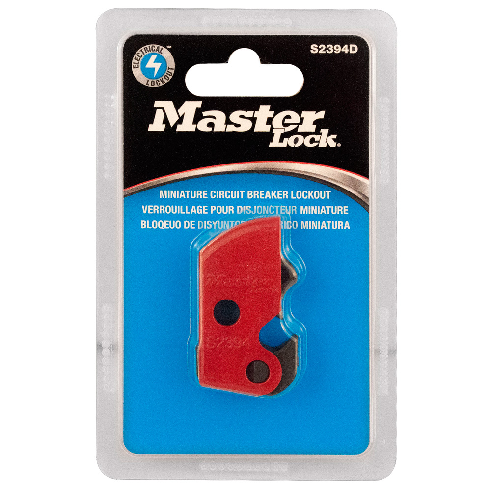 The Master Lock S2394D Universal Miniature Circuit Breaker Lockout Device - packed in carded packaging for showroom display - locks out virtually all miniature ISO/DIN pin-out circuit breakers throughout the world. The patented device features a thumb turn dial screw for easy attachment, no tools required. Device attaches to circuit breaker and makes dial inaccessible in the locked position to prevent removal. Padlock can be applied horizontally or vertically, and design allows device to be mounted side-by-side on adjacent breakers. Device works with all American Lock® and Master Lock® safety padlocks and lockout hasps (does not include ALO80 or ALO802). This carded product is suitable for display in commercial showrooms.