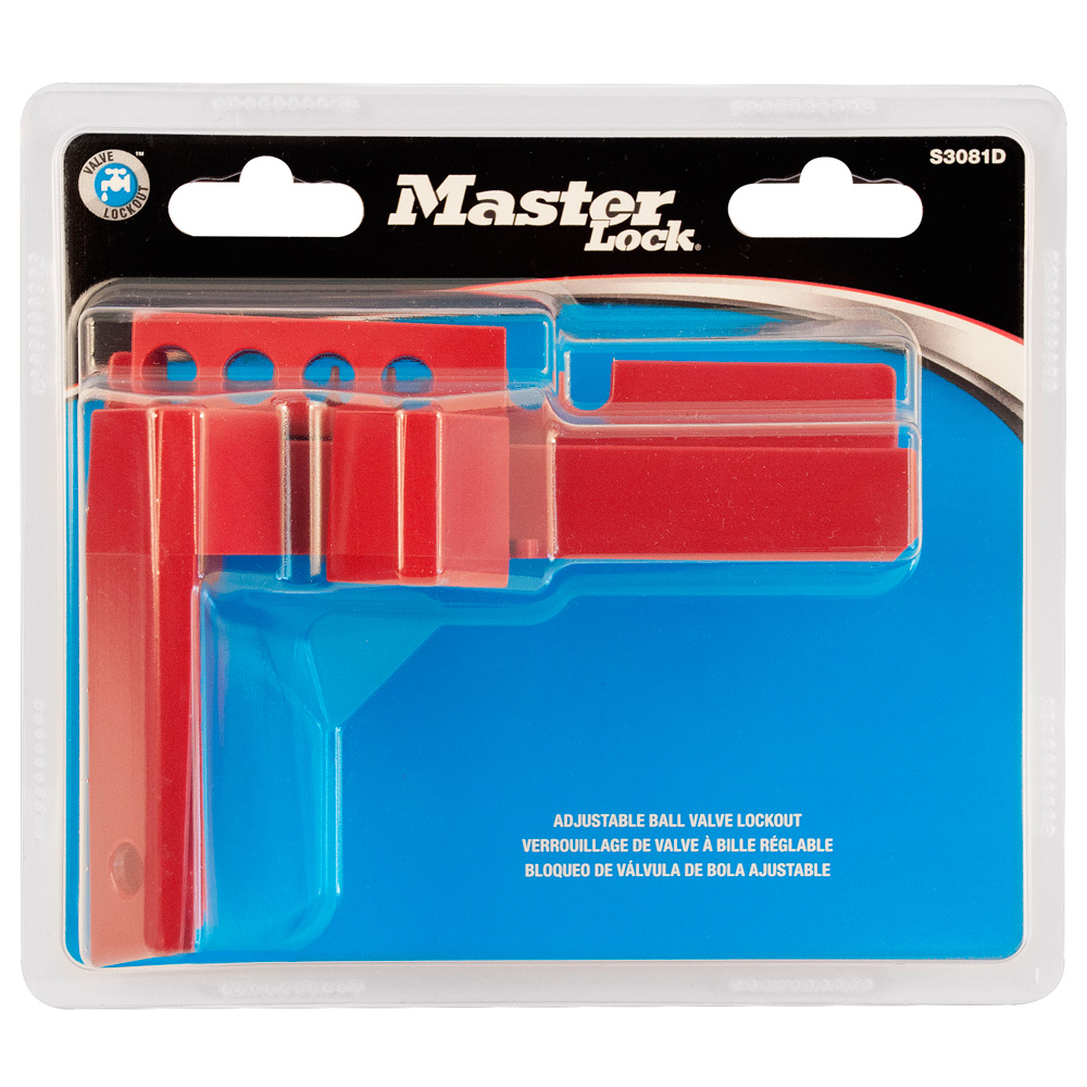 The Master Lock No. S3081D Adjustable Ball Valve Lockout - packed in carded packaging for showroom display - features durable, lightweight Zenex™ thermoplastic material to withstand chemicals and extreme temperatures. Device is easy to use and prevents accidental activation of a closed ball valve. The adjustable design fits 25mm to 51mm valves and four locking holes accept all American Lock® and Master Lock® safety padlocks. This carded product is suitable for display in commercial showrooms.