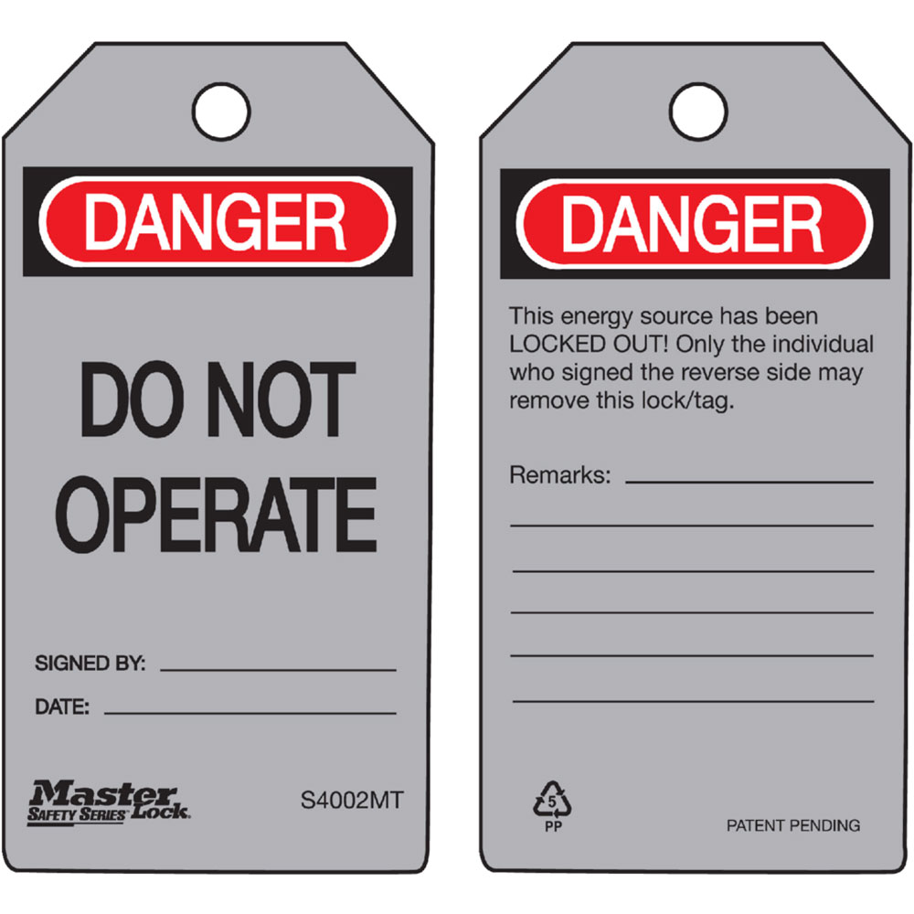 The Master Lock Model No. S4002MT Danger Do Not Operate - Metal Detectable Safety Tag features a process that fuses graphics into rugged industrial-grade polypropylene blended with a metal additive; ideal for use in food processing and pharmaceutical facilities. The longest lasting tags available, the Guardian Extreme tags stand up to wash downs, humidity and extreme temperatures. The longest lasting signs available, Guardian Extreme signs stand up to wash downs, humidity and extreme temperatures.