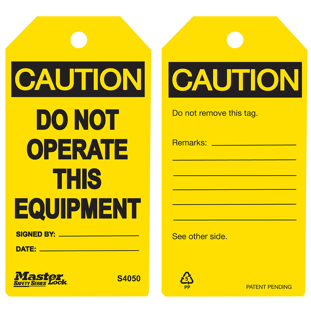The Master Lock Model No. S4050 Yellow Caution Do Not Operate This Equipment - Safety Tag features a process that fuses graphics into rugged industrial-grade polypropylene blended with a metal additive; ideal for use in food processing and pharmaceutical facilities. The longest lasting tags available, the Guardian Extreme tags stand up to wash downs, humidity and extreme temperatures. The longest lasting signs available, Guardian Extreme signs stand up to wash downs, humidity and extreme temperatures.