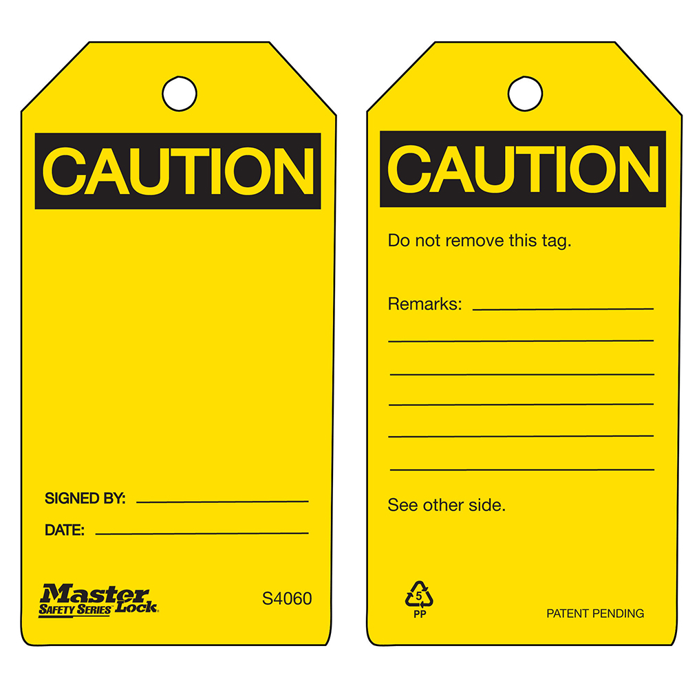 The Master Lock Model No. S4060 Yellow Caution blank - Safety Tag features a process that fuses graphics into rugged industrial-grade polypropylene blended with a metal additive; ideal for use in food processing and pharmaceutical facilities. The longest lasting tags available, the Guardian Extreme tags stand up to wash downs, humidity and extreme temperatures. The longest lasting signs available, Guardian Extreme signs stand up to wash downs, humidity and extreme temperatures.