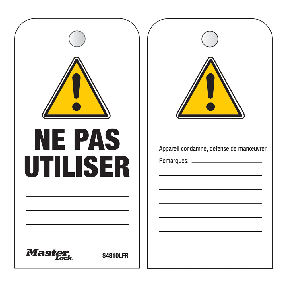 The Master Lock No. S4810LFR French Boxed Roll of tags provides a solution for padlock identification. The box provides convenient storage and transportation between jobs. Included in the box is 100 tags on a perforated roll of tags made of a durable polypropylene material. The tags feature a "DANGER, Do Not Operate" message along with an area for employee’s name, date, and an area for remarks on the work being done.