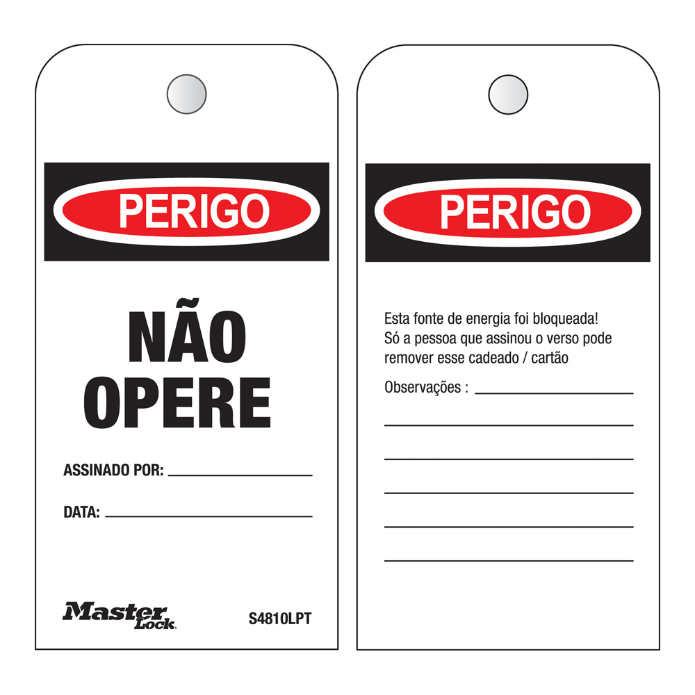 The Master Lock No. S4810LPT Portuguese Boxed Roll of tags provides a solution for padlock identification. The box provides convenient storage and transportation between jobs. Included in the box is 100 tags on a perforated roll of tags made of a durable polypropylene material. The tags feature a "DANGER, Do Not Operate" message along with an area for employee’s name, date, and an area for remarks on the work being done.