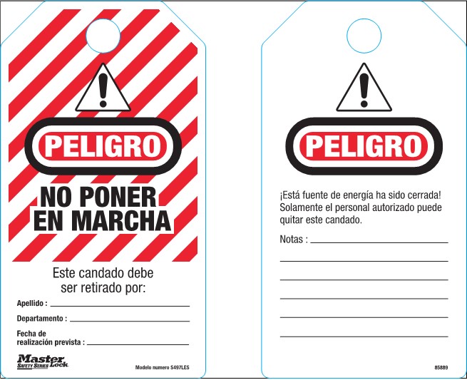 The Master Lock No. S497LES Heavy Duty Safety Tags feature durable polyester laminate to resist water, grease and extreme temperatures. The heavy duty construction withstands over 23kg of pull force to meet best practices. The 11mm diameter brass grommet accepts all safety padlocks. Tags are customizable with name, department and expected completion date.