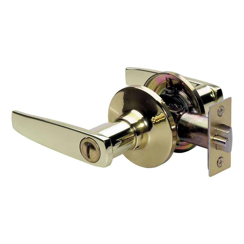 The Master Lock No. SLL0303 features a straight style lever with six-way adjustable latch to fit all doors with 60mm or 70mm backset, square, rounded corners, or drive-in. This knob offers ANSI GRADE 3 performance for interior locking applications. The polished brass finish provides a sleek appearance. The Ten Year Limited Warranty provides peace of mind from a brand you can trust.