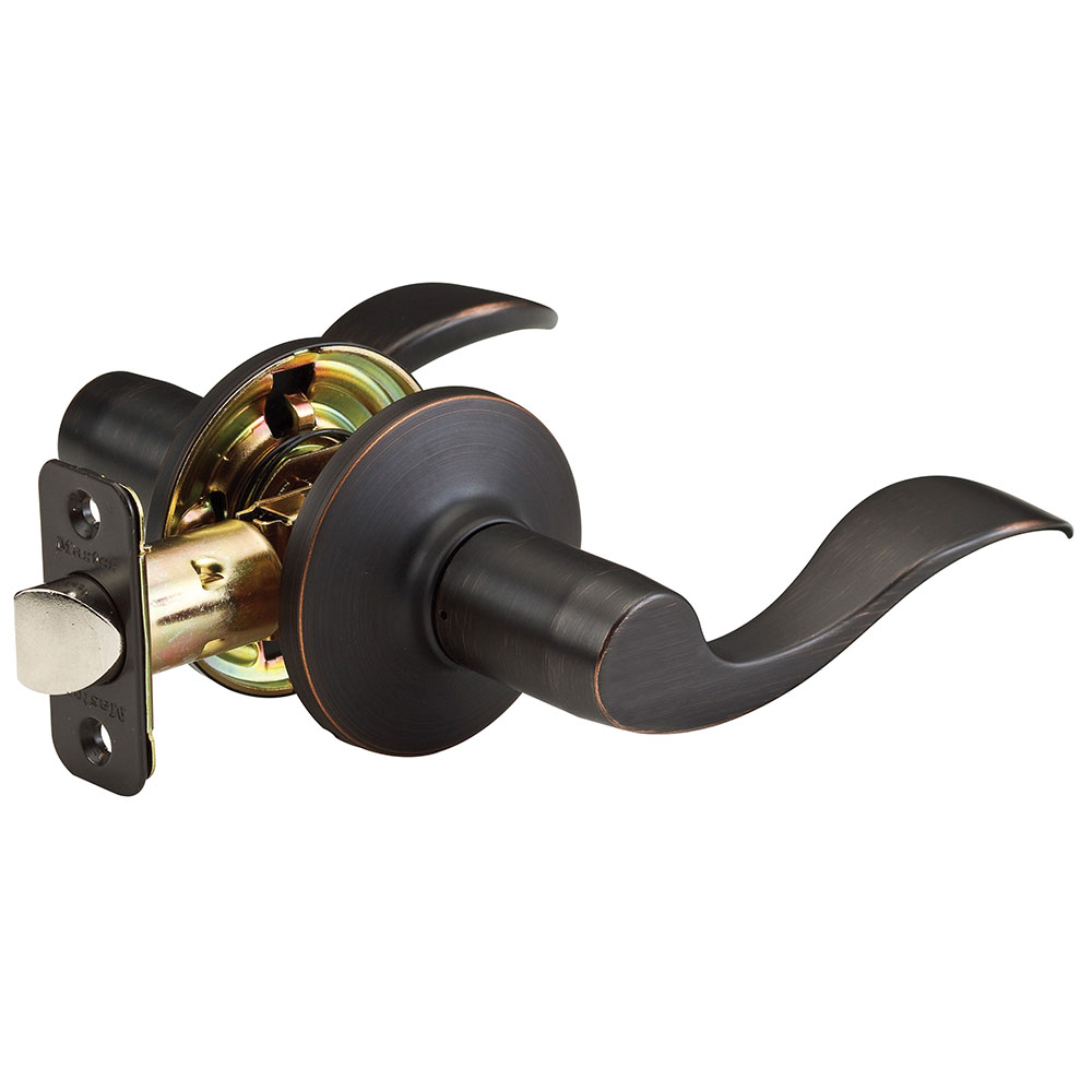The Master Lock No. WL0412P features a wave style lever with six-way adjustable latch to fit all doors with 60mm or 70mm backset, square, rounded corners, or drive-in. This knob offers ANSI GRADE 3 performance for interior non-locking applications. The aged bronze finish provides a sleek appearance. The Ten Year Limited Warranty provides peace of mind from a brand you can trust.