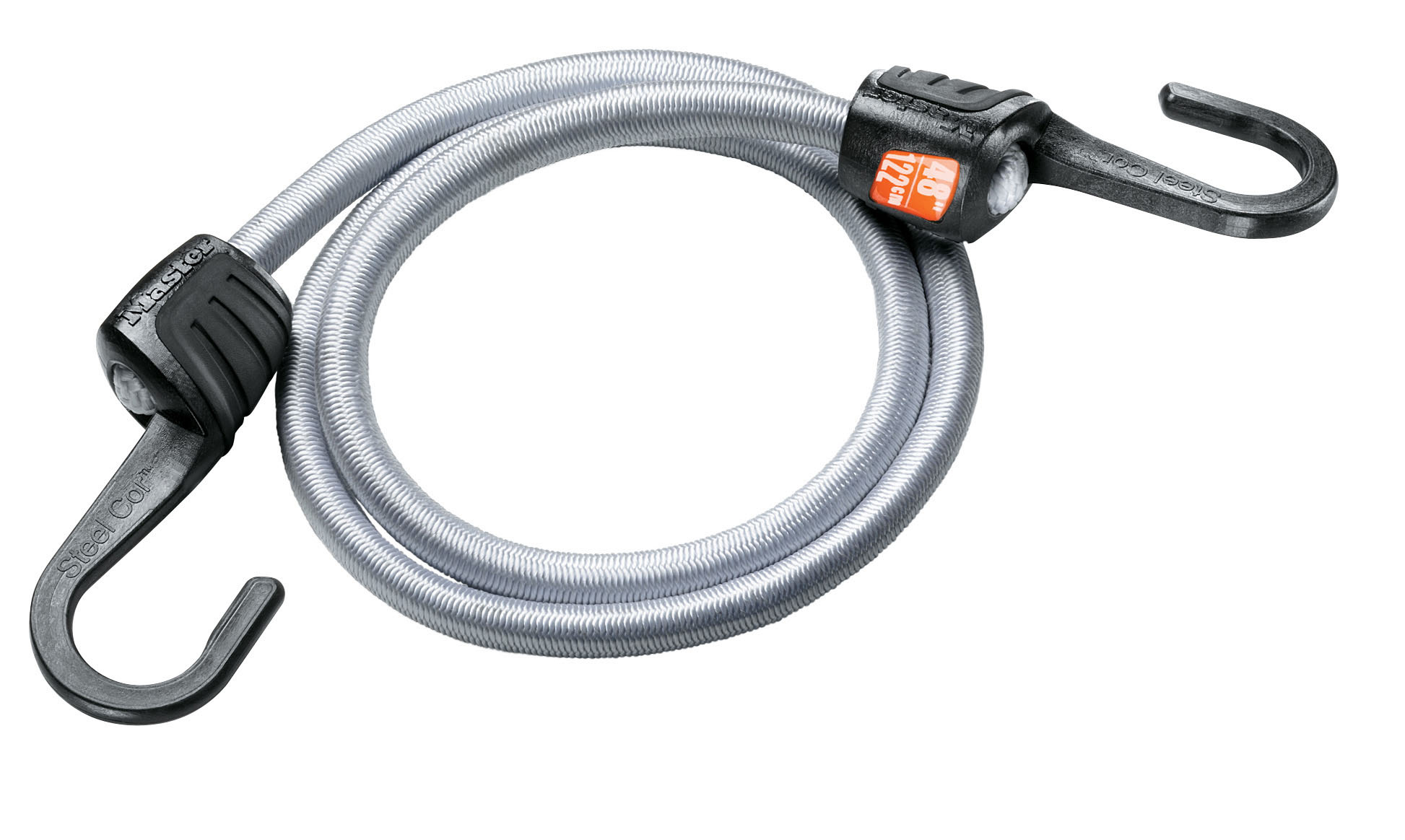 The Master Lock SteelCor™ No. 3036EURDAT features a 1,20m bungee cord with flat, steel I-beam hooks. The hooks are three times stronger than traditional bungee cord hooks. The reverse hook design provides extra room for fastening. The premium quality rubber cord offers superior strength and elasticity.