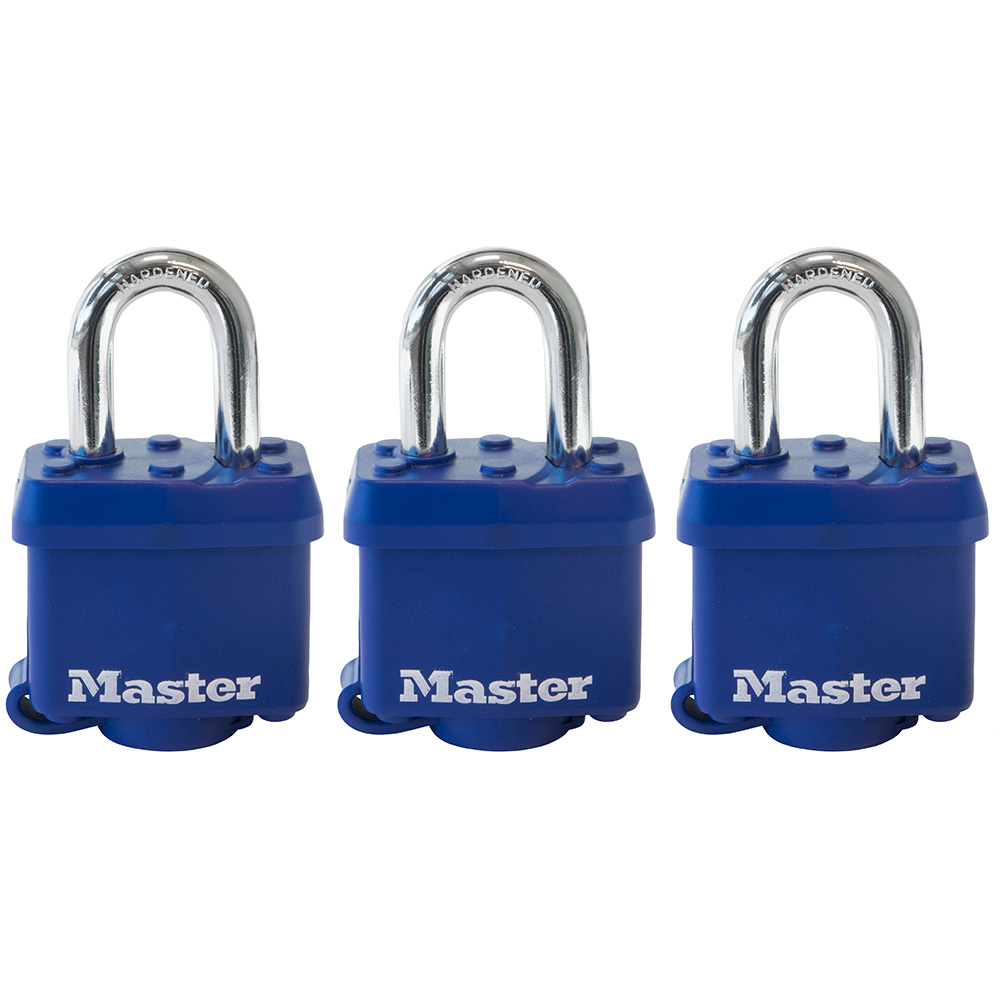 The Master Lock No. 312EUTRI Laminated Padlocks feature a 40mm wide laminated steel body for maximum strength and reliability. The 10mm diameter shackle is 25mm long and made of hardened steel, offering extra resistance to cutting and sawing. A blue weather resistant thermoplastic shell is designed to add protection against moisture, dirt and grime. The 4-pin cylinder prevents picking and the ball bearing locking mechanism provide resistance against prying and hammering. The Limited Lifetime Warranty provides peace of mind from a brand you can trust.