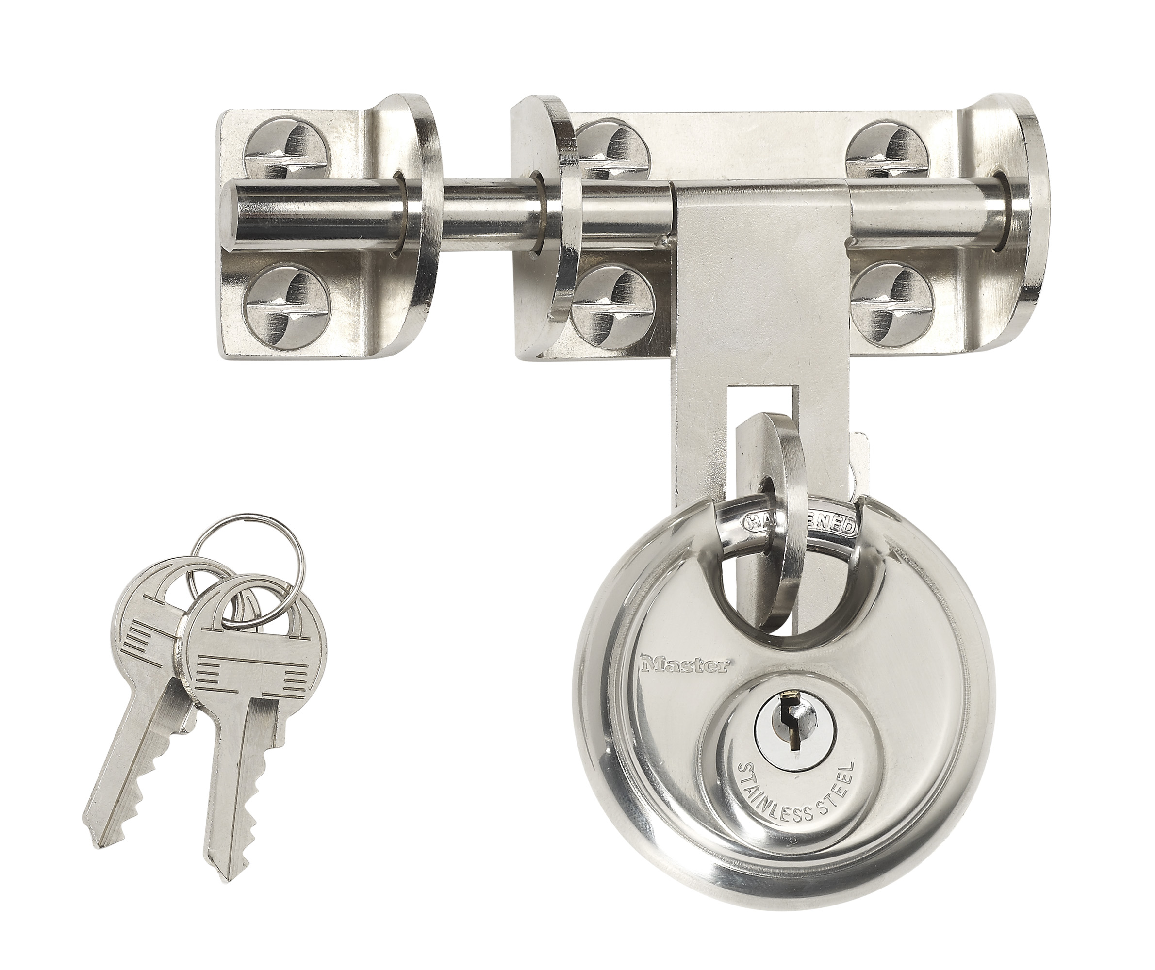 The Master Lock No. 448EURD features a 60mm Keyed Stainless Steel Padlock with 116mm Bolt Hasp made of Chrome Plated Steel for strength and corrosion resistance. The 8mm diameter shrouded hardened steel shackle offers very strong bolt-cutter and rust resistance. The Limited Lifetime Warranty provides peace of mind from a brand you can trust.