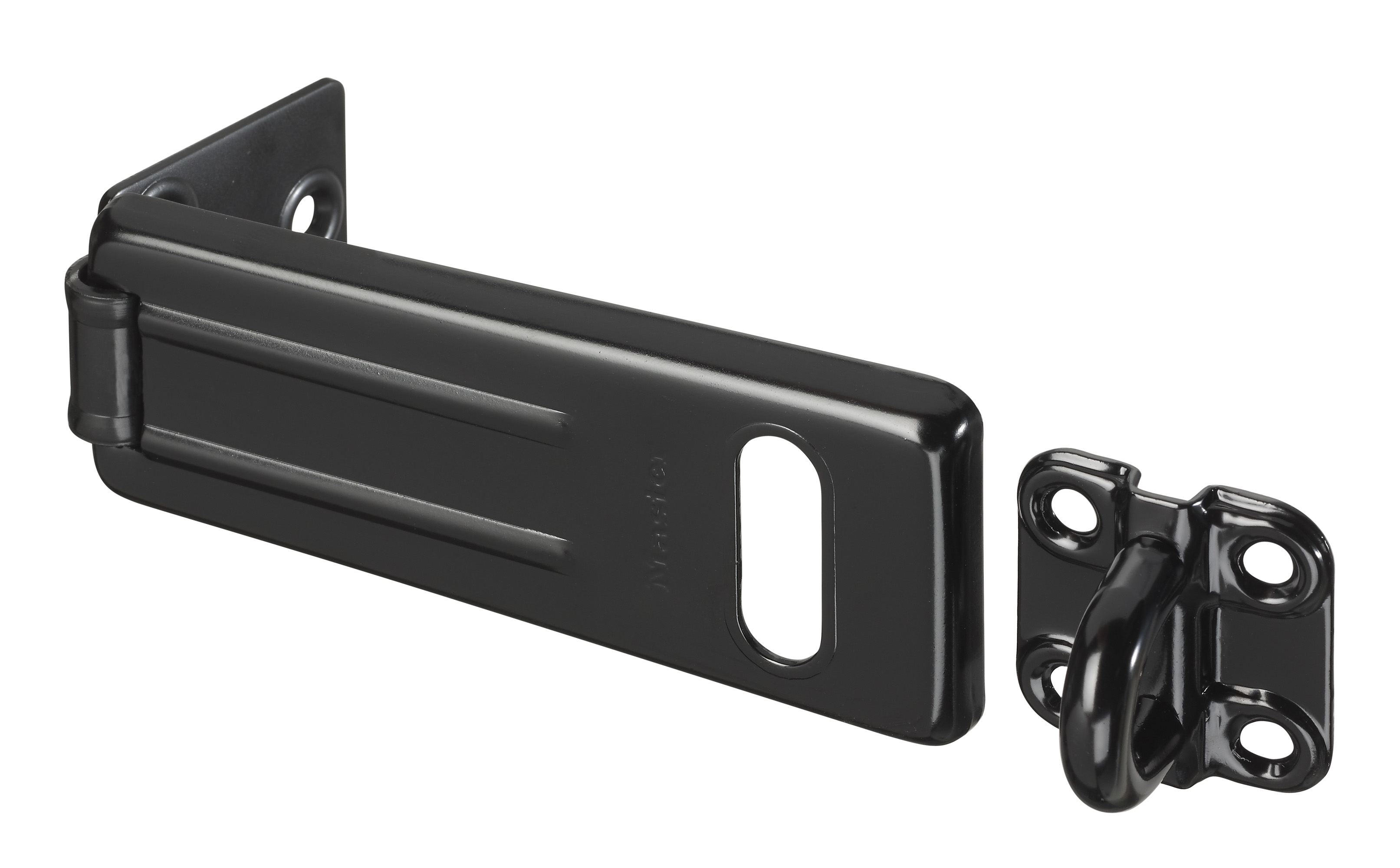 The Master Lock No. 704EURDBLK Hasp features a 110mm long hard wrought steel body. The zinc plated hardened steel hasp provides added strength and weatherability. The hardened steel staple and locking eye resist cutting and sawing. The ribbed hasp plate offers extra strength, and hardened steel locking eye provides strong cut resistance. The Limited Lifetime Warranty provides peace of mind from a brand you can trust.