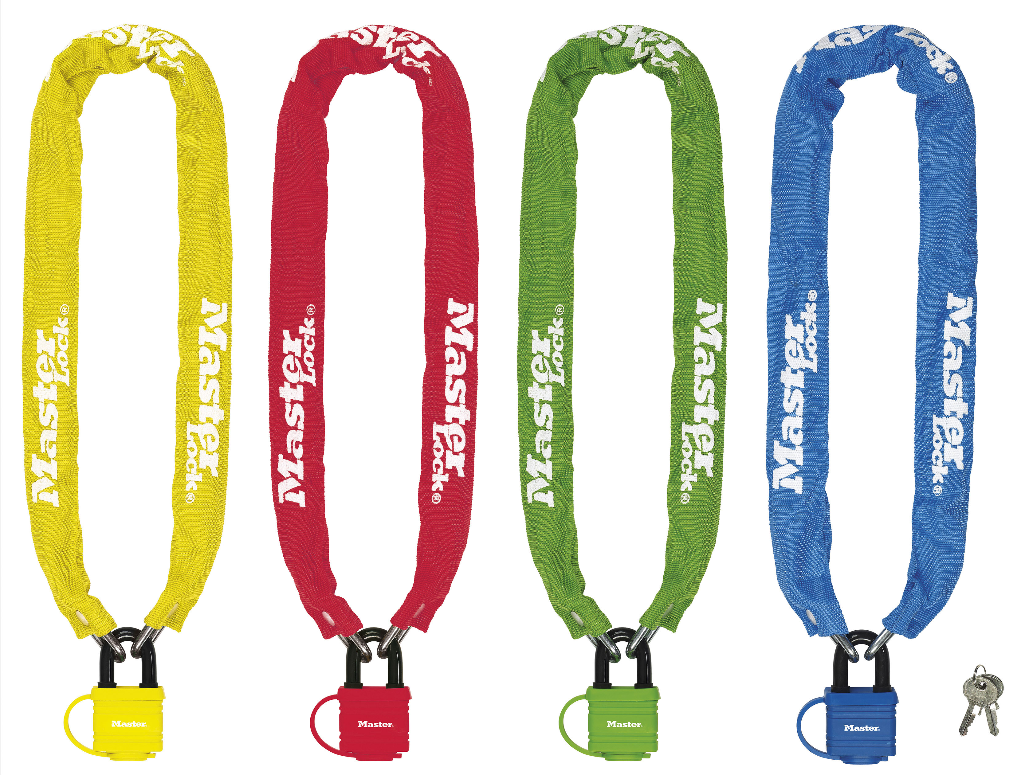 The Master Lock No. 8390EURDPROCOL Chain with Laminated Steel Padlock is 90cm long and features 6mm diameter hardened steel links, offering resistance to cutting and sawing. The nylon sleeve provides additional protection for equipment. The padlock features a 40mm wide laminated steel body for maximum strength and reliability. The 9mm diameter shackle is made of steel for resistance to cutting and sawing. The 4-pin cylinder prevents picking and the dual locking levers provide resistance against prying and hammering. The thermoplastic body and keyway cover makes this lock weather proof. The bright colours simplify identification. The Limited Lifetime Warranty provides peace of mind from a brand you can trust.