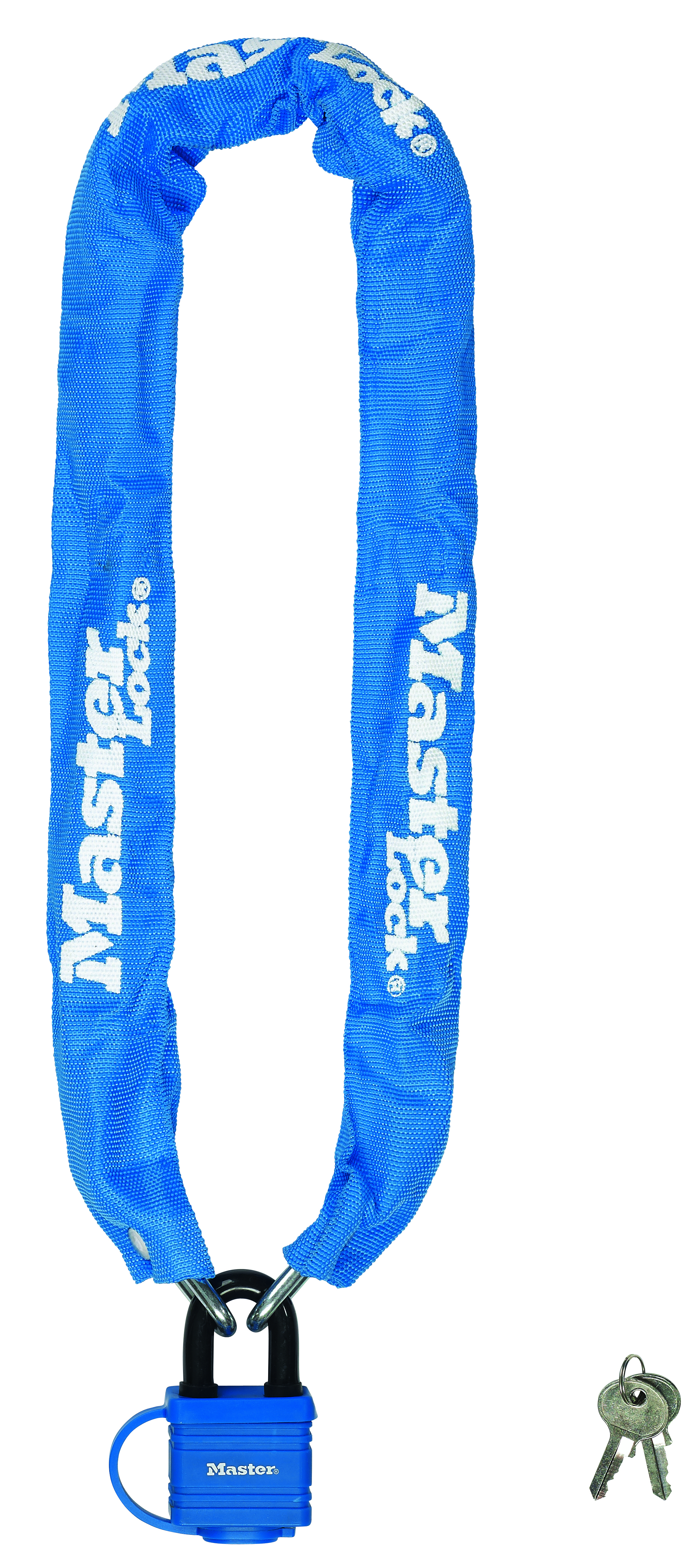 The Master Lock No. 8390EURDPROCOLB Chain with Laminated Steel Padlock is 90cm long and features 6mm diameter hardened steel links, offering resistance to cutting and sawing. The nylon sleeve provides additional protection for equipment. The padlock features a 40mm wide laminated steel body for maximum strength and reliability. The 9mm diameter shackle is made of steel for resistance to cutting and sawing. The 4-pin cylinder prevents picking and the dual locking levers provide resistance against prying and hammering. The thermoplastic body and keyway cover makes this lock weather proof. The bright colour simplifies identification. The Limited Lifetime Warranty provides peace of mind from a brand you can trust.