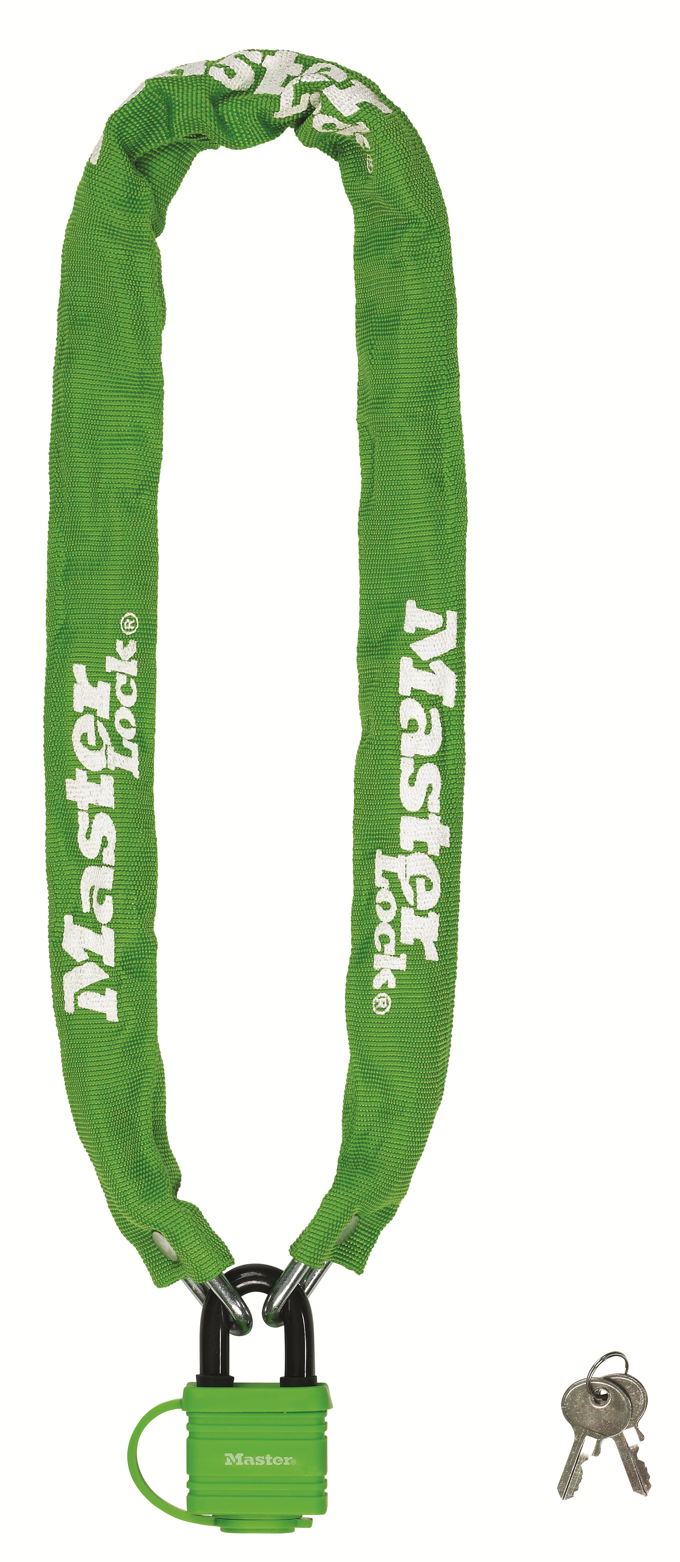 The Master Lock No. 8390EURDPROCOLG Chain with Laminated Steel Padlock is 90cm long and features 6mm diameter hardened steel links, offering resistance to cutting and sawing. The nylon sleeve provides additional protection for equipment. The padlock features a 40mm wide laminated steel body for maximum strength and reliability. The 9mm diameter shackle is made of steel for resistance to cutting and sawing. The 4-pin cylinder prevents picking and the dual locking levers provide resistance against prying and hammering. The thermoplastic body and keyway cover makes this lock weather proof. The bright colour simplifies identification. The Limited Lifetime Warranty provides peace of mind from a brand you can trust.