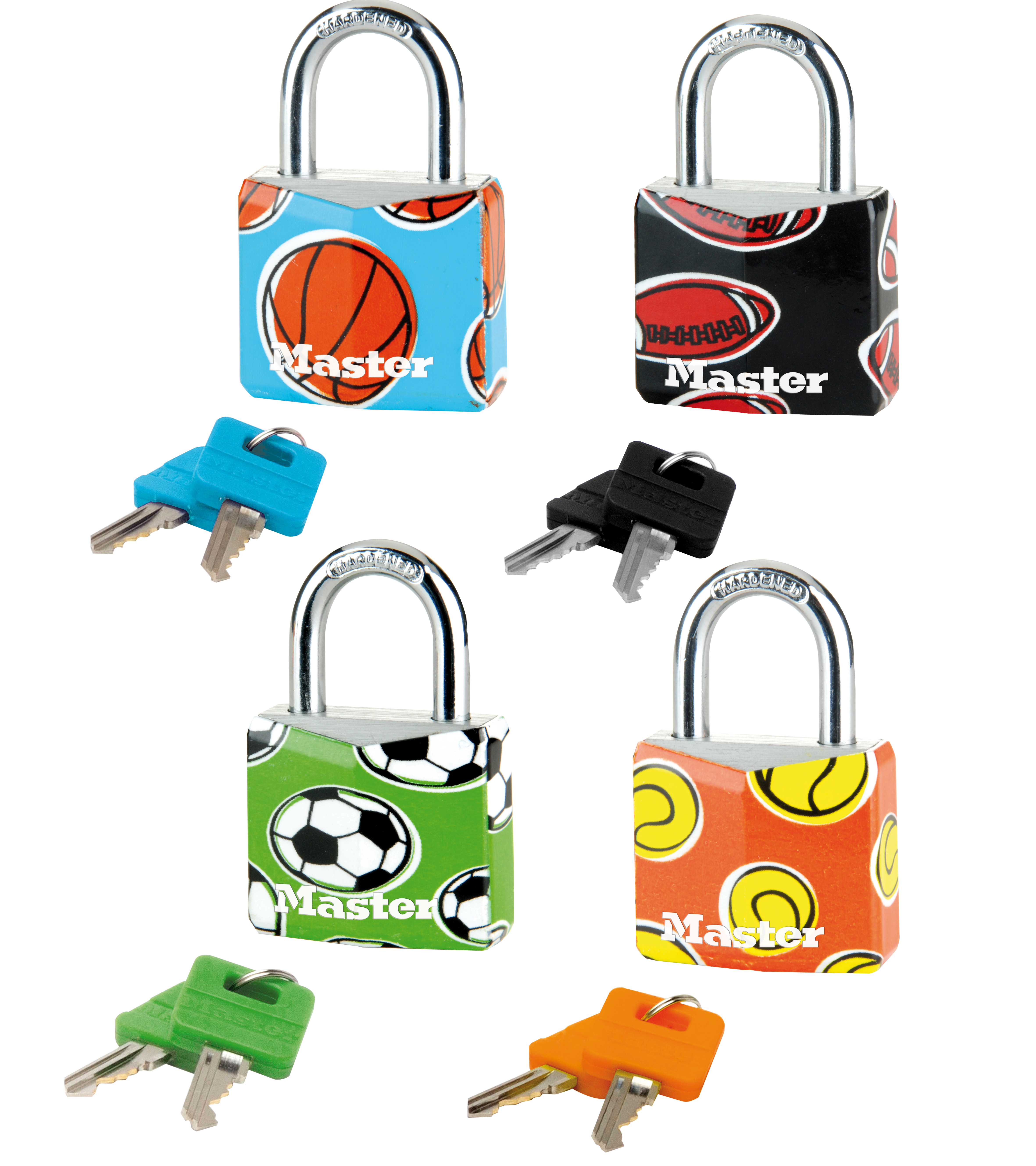 The Master Lock No. 9130EURDPSP Covered Solid Aluminum Padlock features a 30mm wide covered solid aluminum lock body that is durable and resists corrosion. The 5mm diameter shackle is 18mm long and made of hardened steel, offering extra resistance to cutting and sawing. The 4-pin cylinder prevents picking and the dual locking levers provide resistance against prying and hammering. The assorted sport patterns simplify locker identification. The Limited Lifetime Warranty provides peace of mind from a brand you can trust.