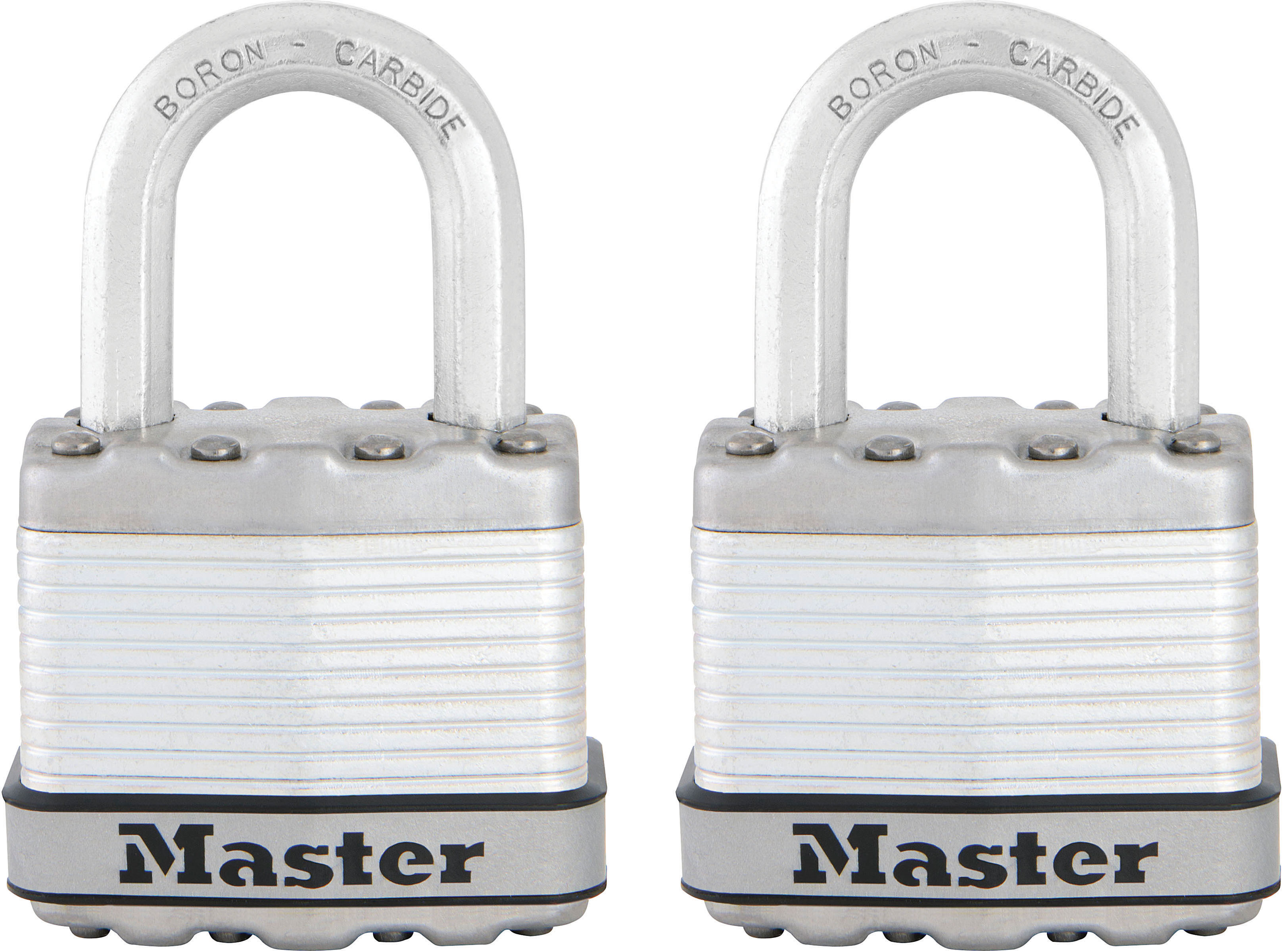 The Master Lock Excell® No. M1EURT Laminated Padlocks feature a 45mm wide laminated steel body for maximum strength and reliability, and are surrounded by stainless steel and zinc outer components for weather resistance. The 8mm diameter octagonal shackle is 24mm long and made of Tough-Cut™ boron-carbide, 50% harder than hardened steel, offering maximum resistance to cutting and sawing. The 4-pin cylinder prevents picking and the dual locking ball bearings provide maximum resistance against prying and hammering. The Limited Lifetime Warranty provides peace of mind from a brand you can trust.