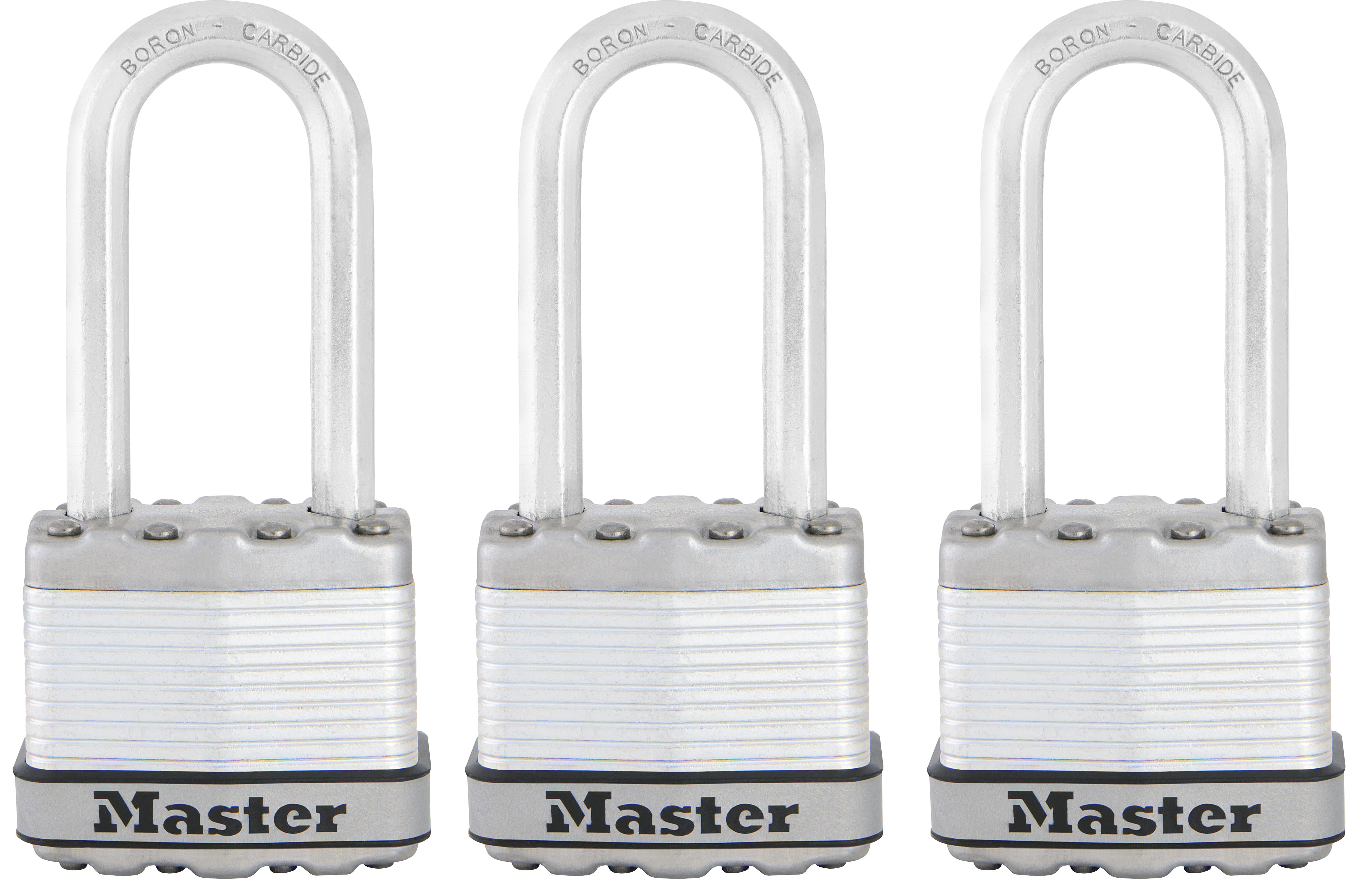 The Master Lock Excell® No. M1EURTRILH Laminated Padlocks feature a 45mm wide laminated steel body for maximum strength and reliability, and are surrounded by stainless steel and zinc outer components for weather resistance. The 8mm diameter octagonal shackle is 51mm long and made of Tough-Cut™ boron-carbide, 50% harder than hardened steel, offering maximum resistance to cutting and sawing. The 4-pin cylinder prevents picking and the dual locking ball bearings provide maximum resistance against prying and hammering. The Limited Lifetime Warranty provides peace of mind from a brand you can trust.