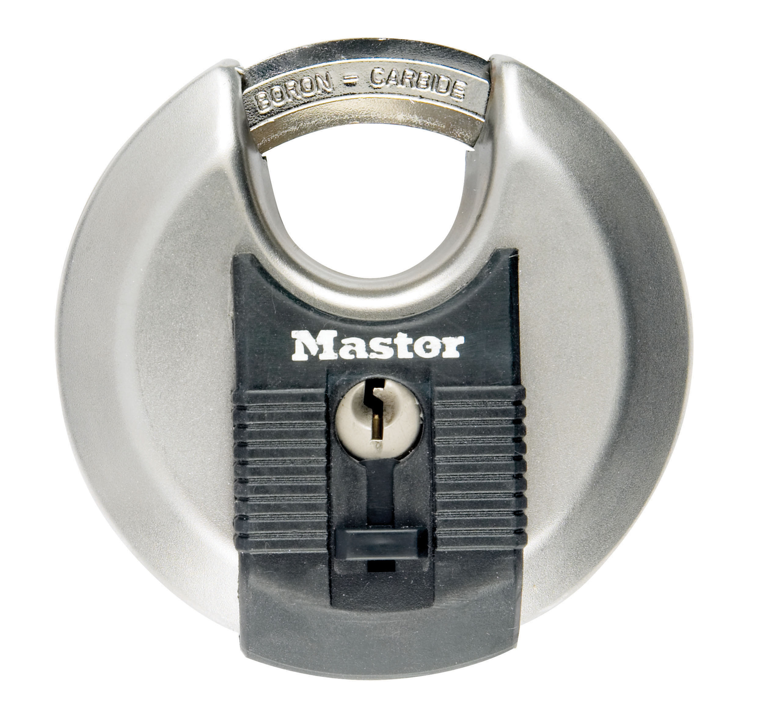 The Master Lock Excell® No. M50EURD Discus Padlock features a 80mm wide stainless steel body for maximum strength, reliability and corrosion resistance. The fully shrouded design minimizes shackle exposure and protects against bolt cutter attacks. The 12mm diameter octagonal shackle is 17mm long and made of Tough-Cut™ boron-carbide, 50% harder than hardened steel, offering maximum resistance to cutting and sawing. The 4-pin cylinder prevents picking and the dual locking ball bearings provide maximum resistance against prying and hammering. The covered keyway offers maximum weather protection, and reinforced body bumper protects against scratches. The Limited Lifetime Warranty provides peace of mind from a brand you can trust.