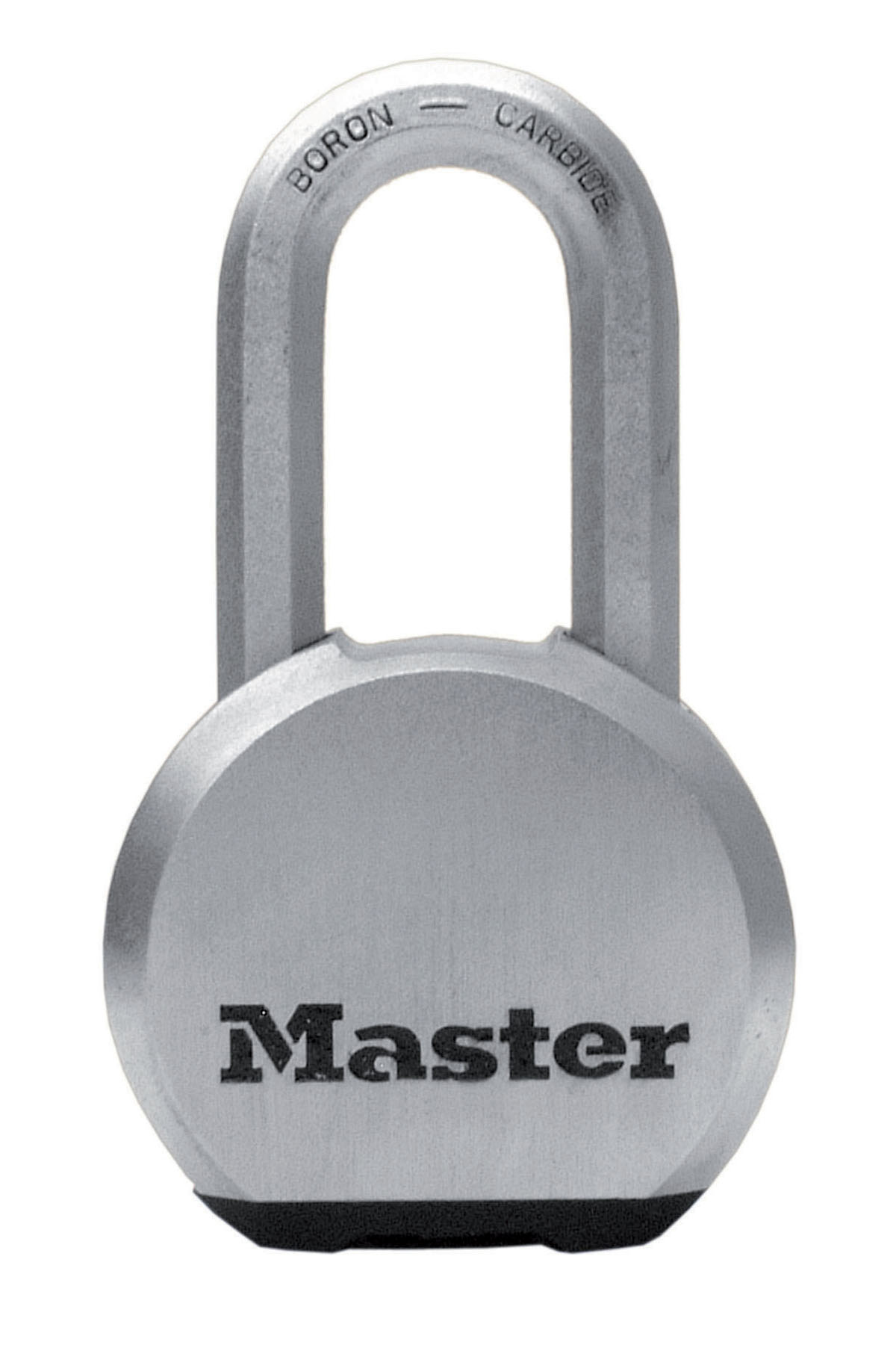 The Master Lock Excell® No. M830EURDLH Solid Body Padlock features a 54mm wide solid steel body for maximum strength and reliability. The 9mm diameter octagonal shackle is 51mm long and made of Tough-Cut™ boron-carbide, 50% harder than hardened steel, offering maximum resistance to cutting and sawing. The 5-pin cylinder prevents picking and the dual locking ball bearings provide maximum resistance against prying and hammering. The covered keyway offers maximum weather protection, and reinforced body bumper protects against scratches. The Limited Lifetime Warranty provides peace of mind from a brand you can trust.